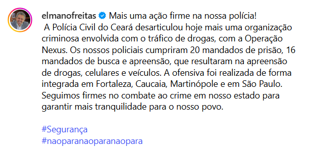 O governador Elmano de Freitas comentou a operação nas redes sociais, destacando que as ações fazem parte do esforço do Estado em combater facções criminosas e o tráfico de entorpecentes no Ceará.