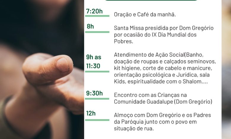 A programação inicia às 7h20, com oração e café da manhã, seguida da Santa Missa às 8h, presidida por Dom Gregório, unindo a comunidade à celebração mundial do Dia dos Pobres. Das 9h às 11h30, serão oferecidos diversos serviços de ação social: banho, doação de roupas e calçados, kits de higiene, corte de cabelo e manicure, além de orientação psicológica e jurídica, sala Kids e momentos de espiritualidade com a Comunidade Shalom.