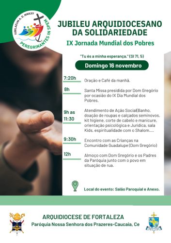 Em sintonia com esse chamado, a Arquidiocese de Fortaleza realiza no domingo, 16 de novembro, o Jubileu Arquidiocesano da Solidariedade, na Paróquia Nossa Senhora dos Prazeres, em Caucaia. O dia será marcado por espiritualidade, escuta, atendimentos sociais e convivência fraterna, expressando o compromisso arquidiocesano com uma fé que se traduz em obras.