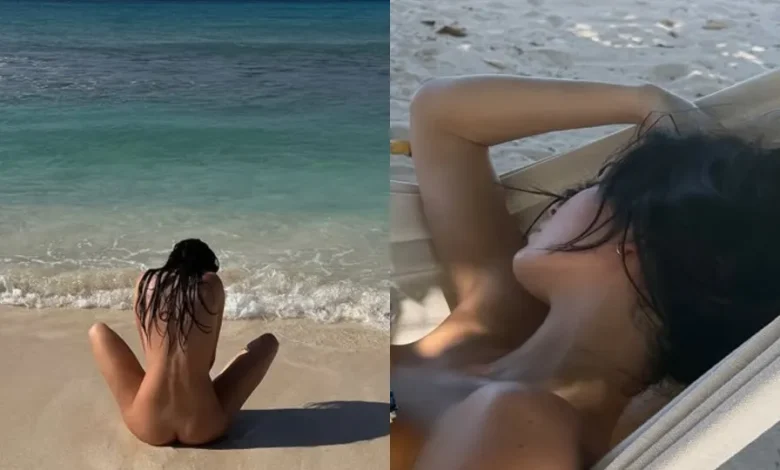 Na primeira das várias fotos publicadas, a modelo aparece de biquíni em um cenário paradisíaco. Nas imagens seguintes, Kendall surge fazendo topless e até completamente nua na praia, celebrando o novo ciclo de vida.