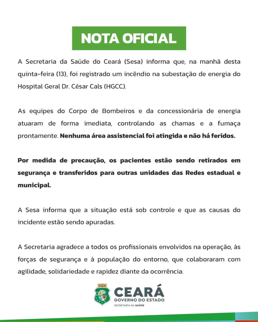 A Secretaria da Saúde do Ceará (Sesa) informou que o incêndio que atingiu, na manhã desta quinta-feira (13), o Hospital Geral Dr. César Cals (HGCC), em Fortaleza, foi causado em por problemas em uma subestação de energia localizada na área externa da unidade. As equipes do Corpo de Bombeiros (CBMCE) e da Enel atuaram de imediato e conseguiram conter as chamas e a fumaça.