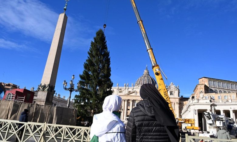 Com a ajuda de um guindaste, a árvore de Natal foi erguida na Praça São Pedro na manhã desta quinta-feira, 27 de novembro, em uma área onde também está sendo montado o presépio vindo, este ano, da província de Salerno, na Campânia, e que terá em sua composição elementos típicos da região de Nocera.
